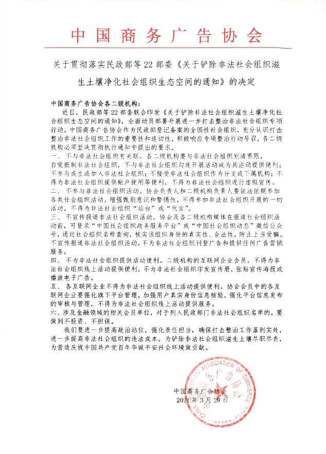 近日,民政部等22部委联合印发《关于铲除非法社会组织滋生土壤净化社会组织生态空间的通知》,全面动员部署开展进一步打击整治非法社会组织专项行动。中国商务广告协会作为民政部登记备案的全国性社会组织,充分认识打击整治非法社会组织工作的重要性和迫切性,积极响应专项整治行动号召,各二级机构必须坚决贯彻执行通知中提出的要求。