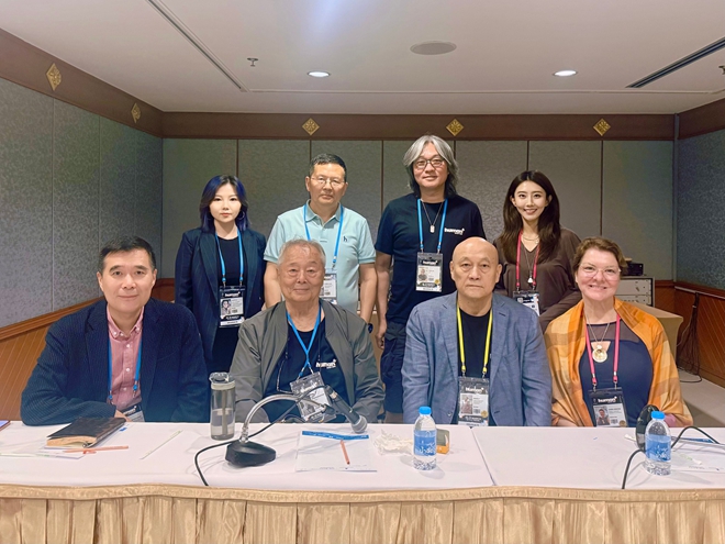 商广协原会长李西沙(前排右二)、副会长陈徐彬(后排左二)、刘阳(后排右二)、王建朝(前排左一)与ADFEST创始人兼主席Vinit Suraphongchai(前排左二)、高级顾问Laura Ashton(前排右一)进行闭门会议