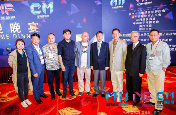 中国商务广告协会会长李西沙(中)、中央政府驻澳办经济部副部长寇明(右四)、中国商务广告协会副会长黄小川(右三)、澳门国际创新节组委会秘书长兼统筹毕志健(左二)